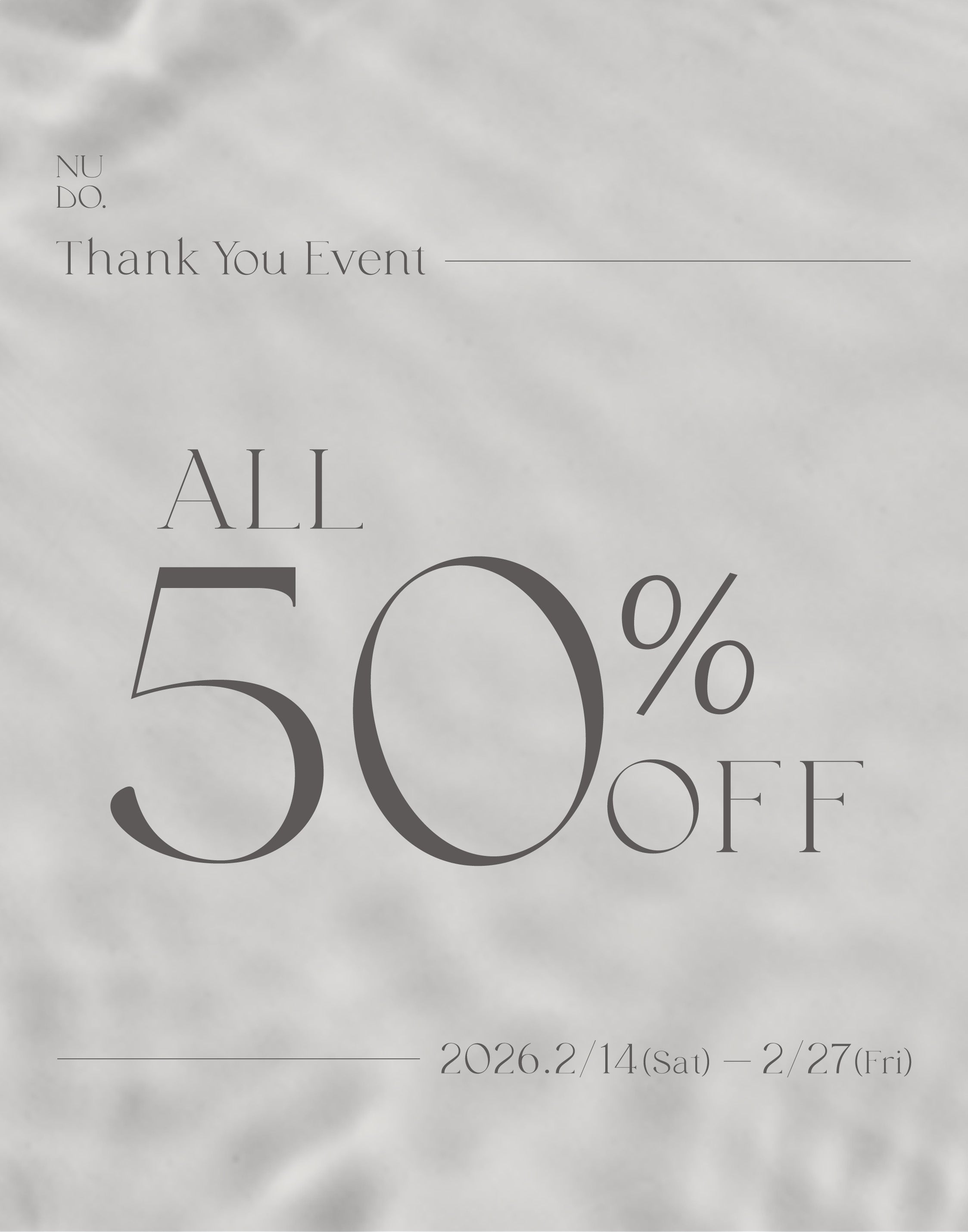 【ブランド終了のお知らせ】 日頃より、NU DO.をご愛顧いただき、誠にありがとうございます。 この度、NU DO.ディレクター成宮寛貴との契約満了に伴い、2026年2月27日(金)18時をもちまして、NU DO.公式オンラインストアを閉店と共に、ブランド終了する運びとなりました。 開店以来、ご愛顧を頂きましたことスタッフ一同心より感謝を申し上げます。 ■個人情報データの取り扱いについて当サイトをご利用の際にご登録いただいた個人情報およびご注文情報は、当社プライバシーポリシーにのっとり、必要な保管期間終了後全て消去いたします。 ■各種SNSについて2026年2月27日(金)をもちまして、以下全てのアカウントは削除となります。・Instagram・LINE・X・TikTok ■お問合せ窓口お問い合わせにつきましては、下記までご連絡をお願いいたします。株式会社ダイヤコーポレーションメールアドレス:contact@nu-do.jp電話番号:03-6910-5085 また、ブランド終了に伴い、明日より感謝の気持ちを込めたセールを実施予定です。各SNS、公式LINE等でお知らせ致しますので、是非ご検討いただけますと幸いです。 急なお知らせとなりましたこと、深くお詫びを申し上げます。何卒ご理解・ご了承を賜りますようお願い申し上げます。